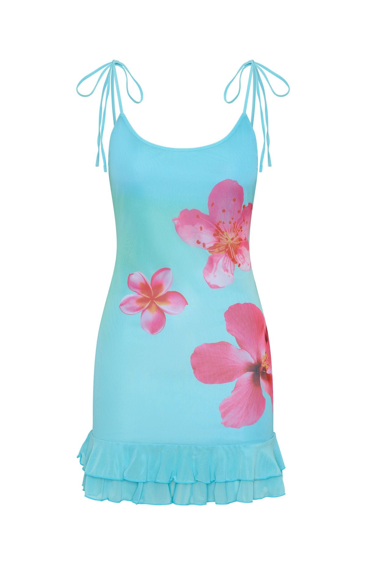 Tiny treasures, major style. The Hot Mess Mini Dress in Hibiscus Splash features thin self‑tie shoulder straps that form sweet bows, a scoop neckline, high‑stretch fabrication and a fully lined fit with a flirty ruffle hem and sash detail at the skirt. Style with heels and layered gold jewelry for a playful, show‑stopping look.