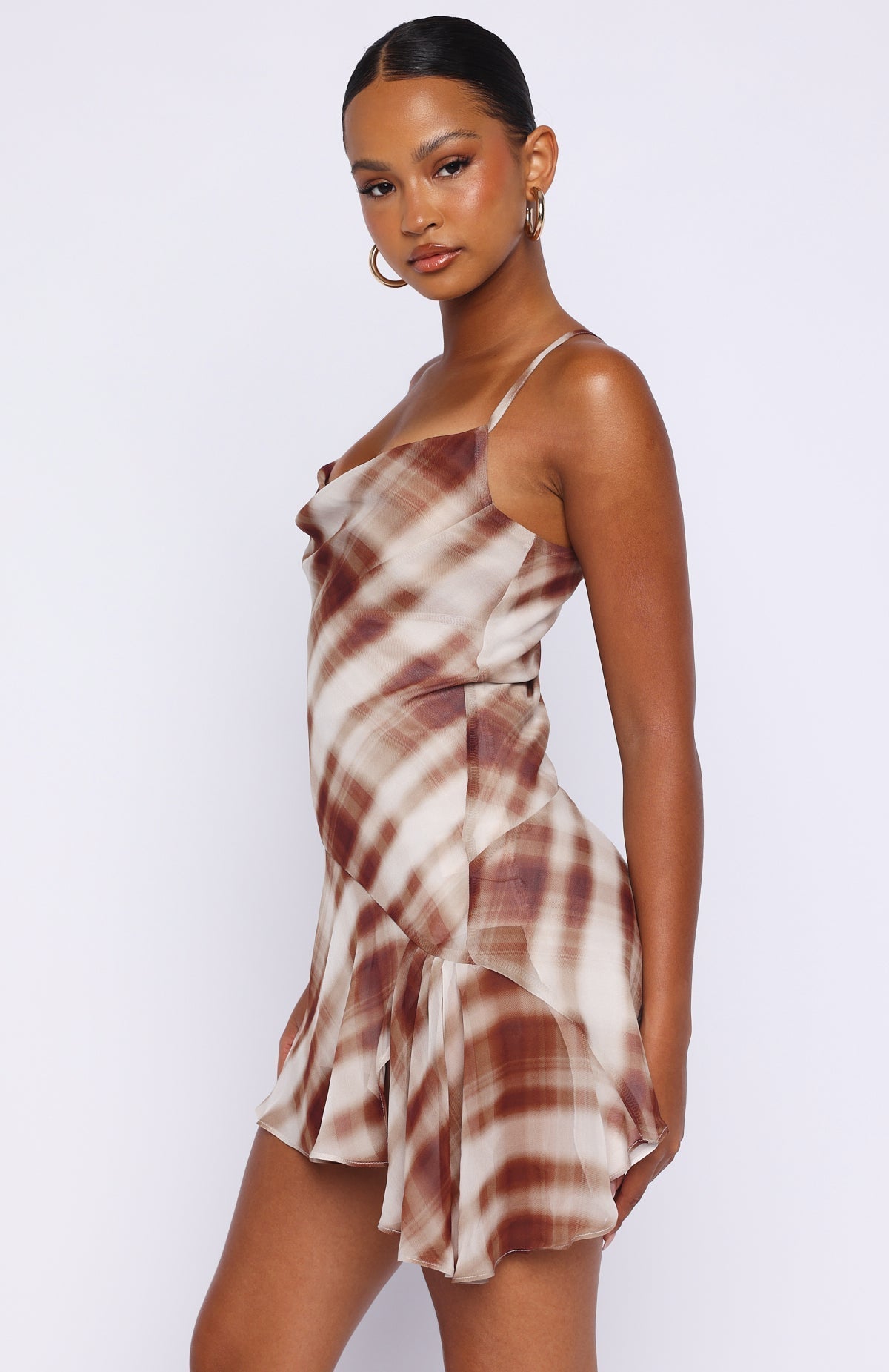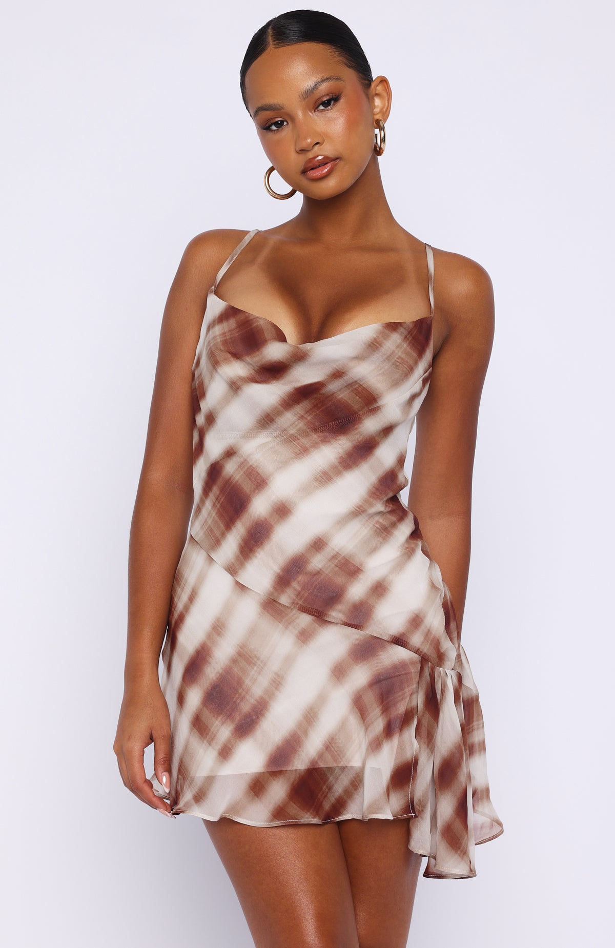 Mini must have! The Personal Touch Cami Mini Dress Chocolate Plaid features an asymmetrical hem with a sultry side split, fully lined for a smooth fit, designed with a draped cowl neckline, adjustable straps, and finished in a statement plaid print. Style with kitten heels and simple gold jewellery for a cute fit.