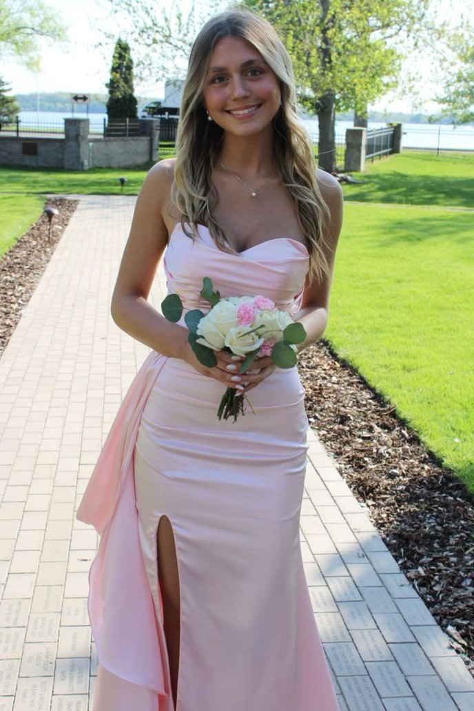 Pink Strapless Sweetheart Pleated Satin Formal Prom Dress with Train